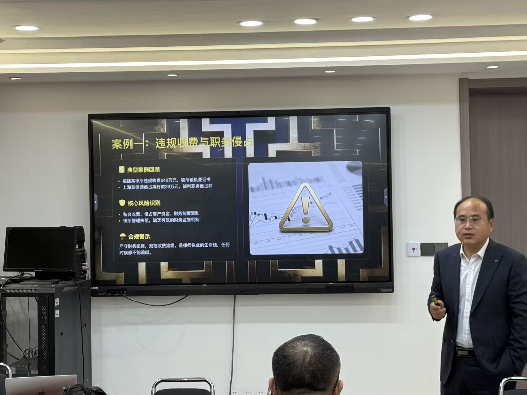 授课环节,梁彬律师以《警钟长鸣,坚守底线——律师行业警示教育专项教育警戒培训》为主题,结合自身深耕法律领域多年的实战经验与丰富的案例积累,从五个方面展开系统讲解。他首先阐释了警示教育的时代意义与核心内涵,强调了合规执业对于维护行业形象、保障法律服务质量的重要性;随后,通过剖析律师行业典型违规案例,直观展现了违法违规执业的严重后果,为参会人员敲响警钟;接着,精准梳理了执业过程中的高频风险点,帮助参会人员精准识别执业隐患;在此基础上,就如何构建全方位风险防范体系提出具体可行的建议,助力律所规范投诉管理流程、从业人员提升风险应对能力;最后,结合行业发展趋势,倡导全体从业人员坚守初心使命,努力做党和人民满意的好律师。