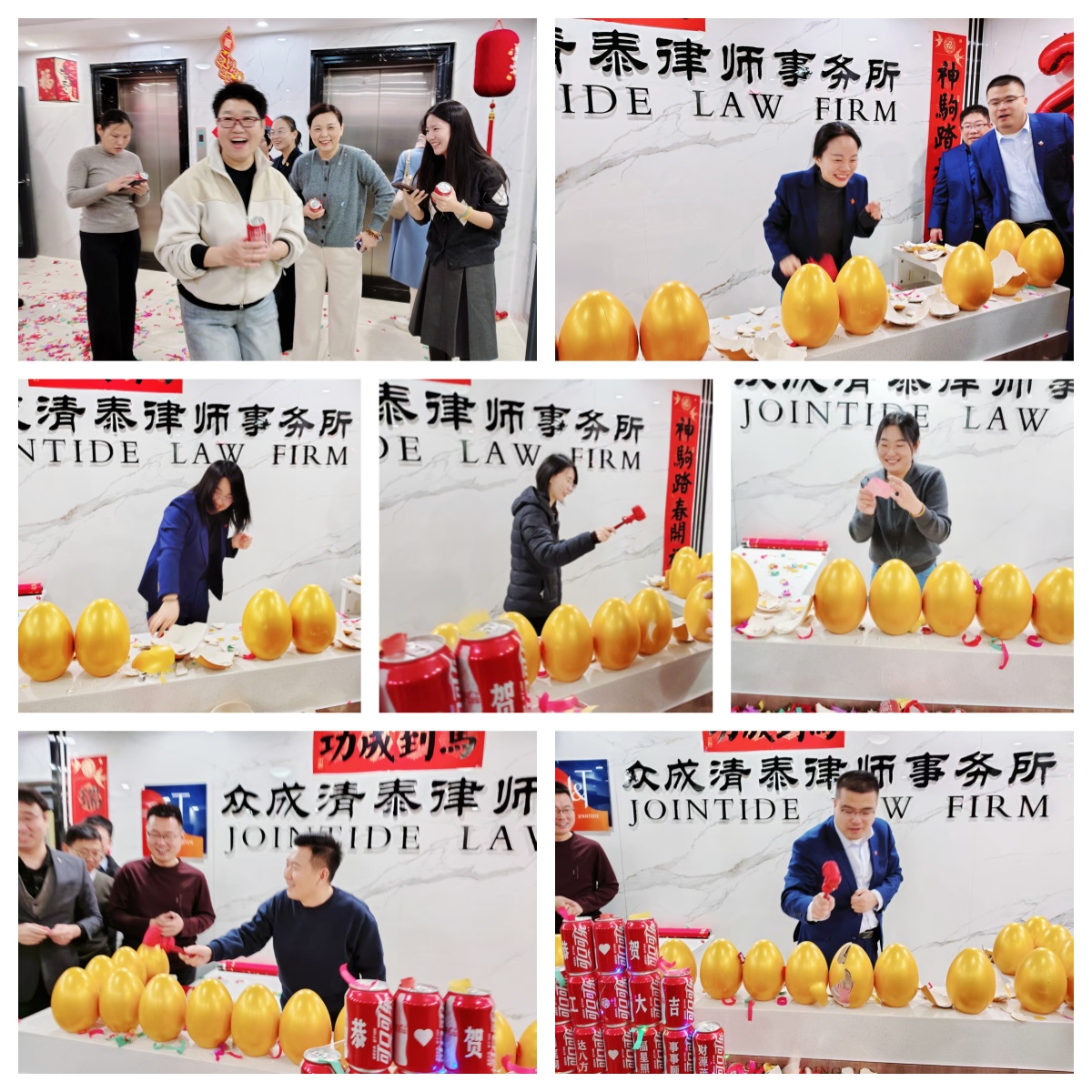 走进律所大厅,满目金光熠熠,一枚枚精心准备的金蛋整齐排列,寓意着希望与好运。伴随着清脆的“砰”然声响,金蛋应声而裂,碎片飞溅间,象征破除旧局、迎来新生。红包与祝福语纷纷跃出,现场惊喜连连,笑声与喝彩声此起彼伏,气氛热烈而温馨。